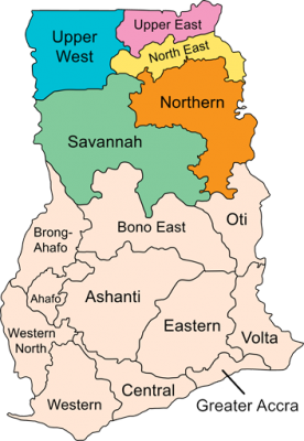 Ghánában az előbb említett 5 régió a legszegényebb területek köze tartozik, itt a legtöbb ember vidéken él. A vidéki területeken pedig lényegesen nagyobb a vakság es latascsokkenes gyakorisag a városokhoz képest.